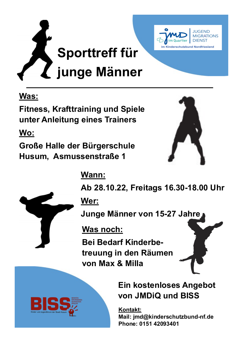 Sporttreff für junge Männer29. November 2022Ab dem 28.10.2022 bietet der Jugendmigrationsdienst einen Sporttreff für junge Männer an. /wp-content/uploads/kinderschutzbund-nf-logo.png 0 0 Jane Henning /wp-content/uploads/kinderschutzbund-nf-logo.png Jane Henning2022-11-29 11:22:092024-04-12 11:23:51Sporttreff für junge Männer